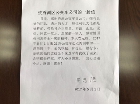 5月3日,乘客農先生親自趕到市公交公司秀洲分公司,將一封親筆簽名的感謝信送到值班人員手中,感謝21路姚國強師傅拾金不昧的雷鋒精神。信中這樣寫道:“感謝秀洲公交車貴公司,擁有良好的團隊,杰出的人才,每位司機大佬都是好樣的,帶給社會正能量,和諧,正職,誠信,同飲一江水,溫馨的一家人。”